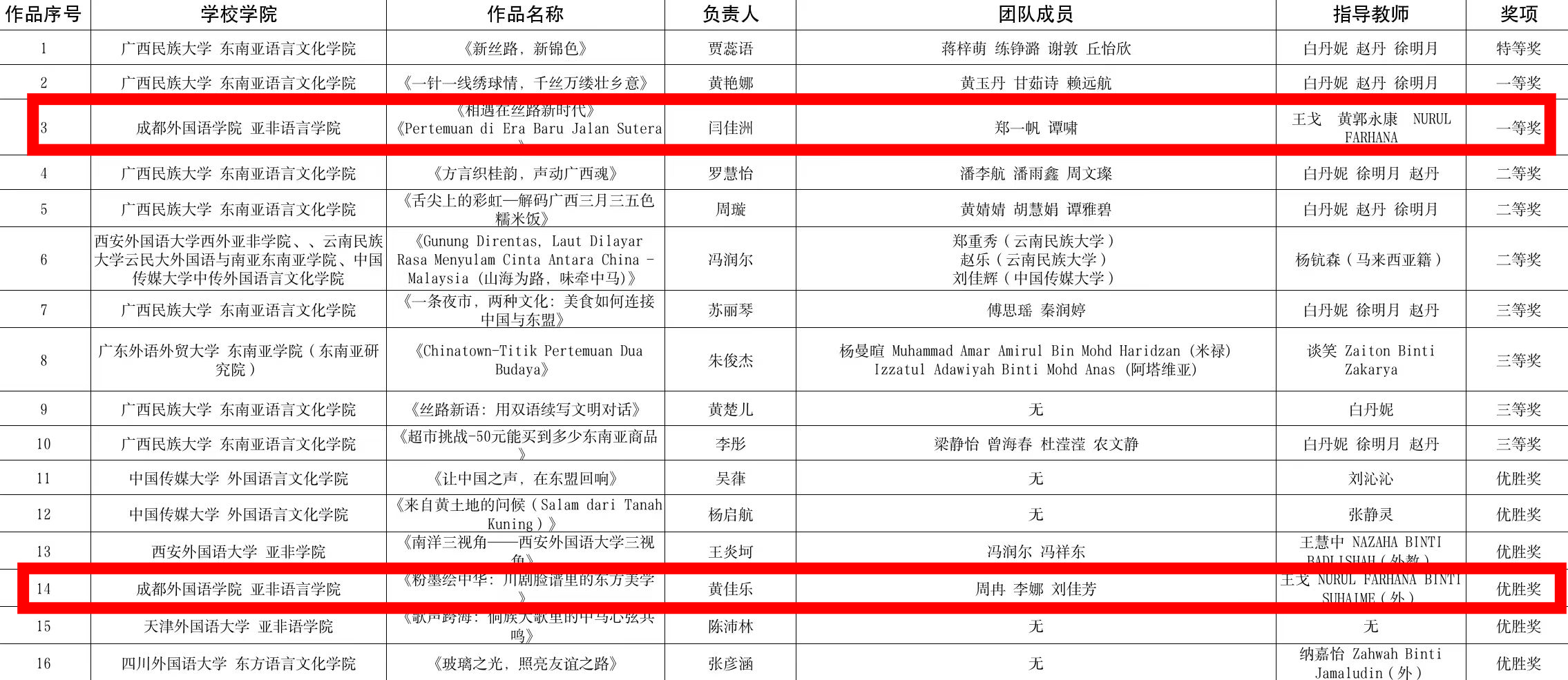3月17日,“红色印记·魅力中国”第二届“东盟语言讲中国故事”短视频大赛获奖名单正式揭晓。我院马来语专业两支学生团队凭借精湛的专业能力与富有创意的影像表达,在全国众多参赛队伍中脱颖而出,分别摘得大赛一等奖与优胜奖,充分展现了我院外语学子扎实的专业素养与青春向党、讲好中国故事的时代风采。