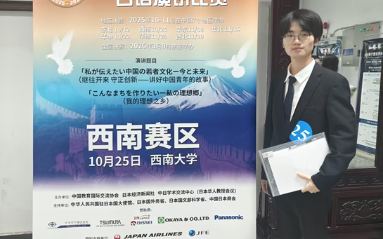 2025年10月25日,第十九届中华全国日语演讲比赛西南赛区比赛在西南大学圆满落幕。亚非语言学院2022级日语专业学生吕鑫代表我校参赛,凭借扎实的语言功底与出色的现场表现,最终荣获三等奖,充分展现了我校日语专业人才培养的优良成效。本次赛事汇聚云贵川渝四地共30所院校的优秀选手,同台竞技,竞争尤为激烈。四川大学、四川外国...