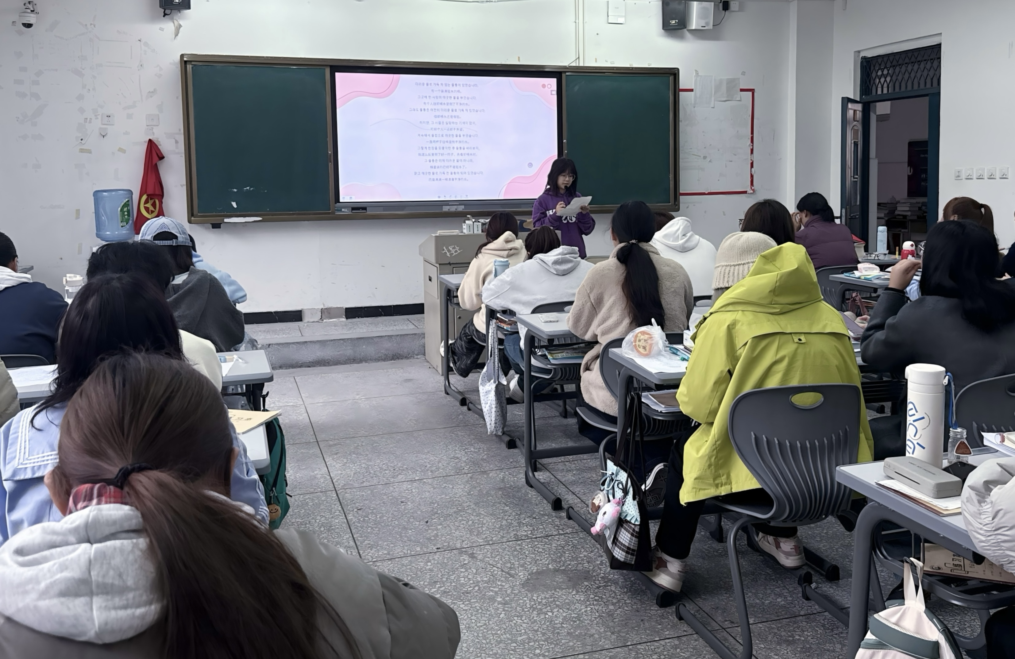 本次活动由2025级韩语专业全体新生参与。入学仅一个月的他们,凭借对韩语的热爱与坚持,用饱含感情的诵读展现了初学者的无限潜力。从发音的准确到语调的自然,从文字的理解到情感的表达,他们用声音传递出韩语的独特韵味。诵读内容涵盖了韩国经典诗文、现代散文与影视对白,每一段朗诵都赢得了阵阵掌声。活动现场气氛热烈,同学们互相鼓励、共同进步,展现了韩语学习路上的青春与激情。