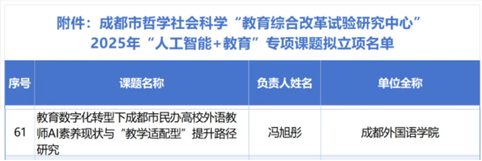 我院1课题获批成都市教育综合改革试验研究中心2025年“人工智能+教育”专项课题立项