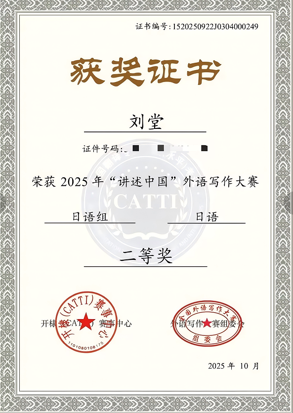 近日,亚非语言学院日语专业2023级罗亮、杨喜渊、刘堂三位同学,凭借扎实的日语语言功底与充分的赛前筹备,在2025年“讲述中国”外语写作大赛中脱颖而出,强势斩获一等奖1项、二等奖2项。日语专业教师李响、任慧慧凭借专业细致的指导,荣获“优秀指导教师”称号。