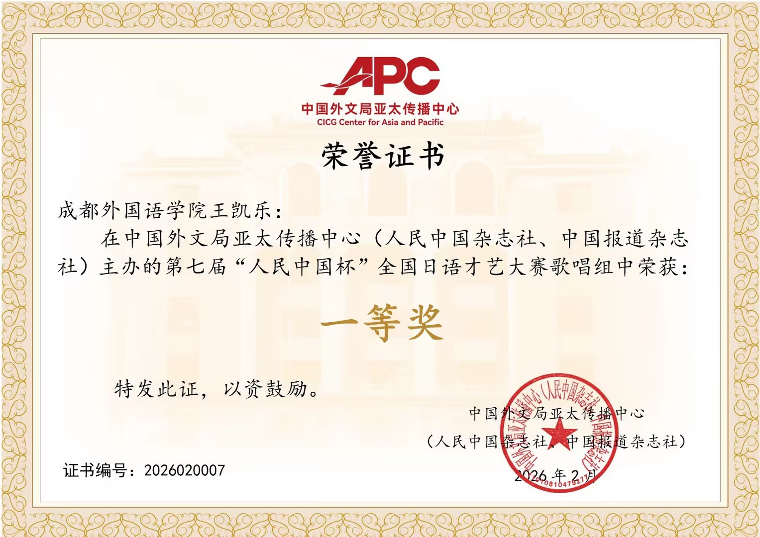 近日,第七届“人民中国杯”全国日语才艺大赛圆满落下帷幕,我院日语专业学子凭借扎实过硬的语言功底,在全国众多高校参赛选手中脱颖而出,2023级日语2班王凯乐获一等奖、2023级日语2班叶明杰二等奖、2023级日语5班杨喜渊三等奖、2024级日语1班唐雨婷、周文豪(组合)三等奖。