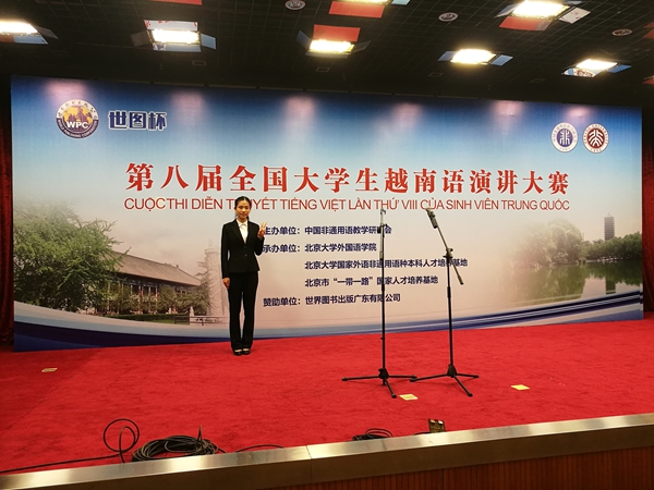 9月28日,第八届全国大学生越南语演讲大赛在北京市北京邮电会议中心落下帷幕,我系2015级越南语专业学子陈娇参加了比赛并荣获大赛一等奖。