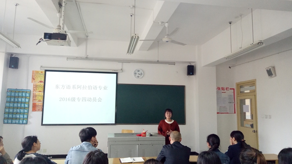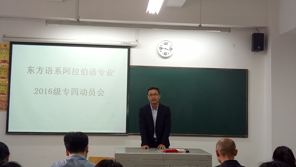 5月10日下午,我系阿拉伯语专业在一教B310教室召开了2016级专四动员会。系主任黄华宪副教授、阿拉伯语专业四级备考小组老师、2015级优秀学生代表以及2016级全体学生参加了本次动员会。