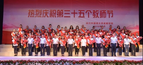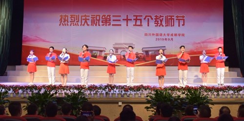 会上,我院日语专业包融、高粱等同学用满怀深情的朗诵《致亲爱的老师》,表达了对老师们的崇高敬意和真诚感恩。党委书记、校长尹大家代表学校党政致辞,向全体教职工致以了诚挚的节日问候,他列举了我校教职工爱岗敬业、博学善教、勇于担当、甘于奉献、热爱学校的生动事例,对老师们的良好风貌和出色风采给予了高度评价。尹校长表示,学校将一如既往地实施人才强校战略,让每一位教职工都能舒心从教、安心从教、热心从教,让每一位川外成都学院人都拥有更加强烈的获得感、归属感和幸福感。面对新时代新使命新征程,他希望全体教职工不忘为国立教的初心、坚定正确政治方向,不忘立德树人的初心、巩固良好师德师风,不忘学高为师的初心、提升自身专业素质,不忘教书育人的初心、精心开展教育教学,不忘关爱学生的初心、引领学生健康成长,不辜负学生们成才的渴望,不辜负学生家长和社会各界的殷殷重托,为实现学校创建特色鲜明的一流应用型大学的发展目标而努力奋进,以优异的成绩向新中国成立70周年热烈献礼。