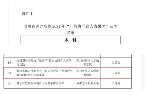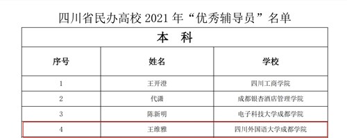 近日,根据《四川省民办高校“教育教学内涵建设项目”评审管理办法》,以及《关于开展 2021 年四川省民办高校产教融合协同育人典型成果评奖的通知》、《关于开展 2021 年四川省民办高校优秀辅导员评选的通知》等文件精神,由四川省民办教育协会高等教育专业委员会、四川省民办教育协会研究中心共同牵头对“产教协同育人成果奖”、“优秀辅导员”组织评审。我院教师团体荣获产教协同育人成果奖三等奖1项,王维雅老师被评为2021年四川省民办高校优秀辅导员。