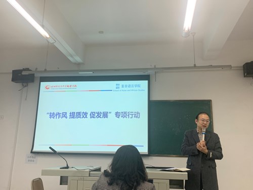 3月6日晚,我院在E208召开“转作风 提质效 促发展”专项行动内容学习和行动部署会。院党委书记钟伟、院长刘轩,全院64名教工参加会议。