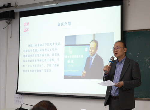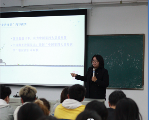启动仪式后,刘轩博士作题为《走进亚非》的第一期“知行大讲堂”公益讲座。她谈到“欲悉各国情形,必先谙其言语文字”,语言是文化的载体。仅仅掌握语言还远远不够,还需要深入了解语言对象国的社会、历史和文化,为成为中外人文交流人才奠定必要的知识基础。通过新闻解读的方式,了解和思考我们自己,以及我们中国所在的地区,鼓励同学们用外语讲好中国故事。